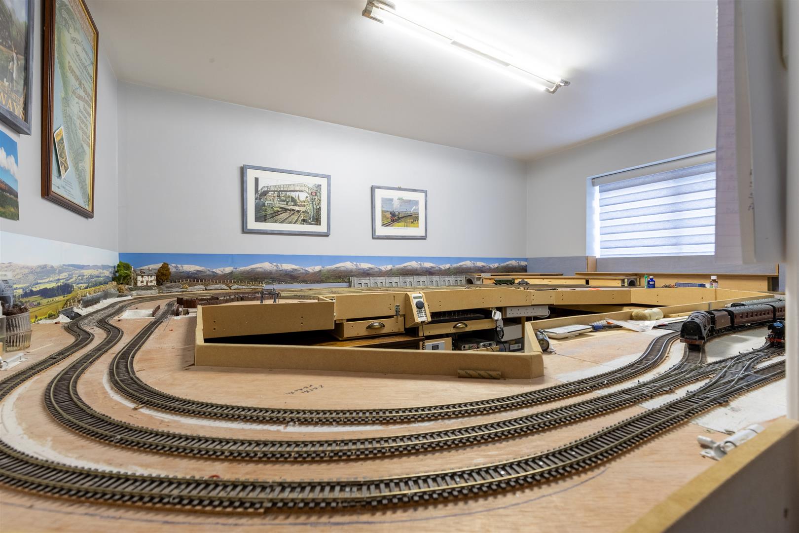 Dimensions: 4.83m x 2.59m (15'10" x 8'6"). An impressive contemporary gloss finished array of wall, base and drawer units in contrasting dark grey and white. Upgraded attractive Pale grey quartz work surfaces, splashbacks, and window cill. Recessed ceiling lights, UPVC double glazed window to the rear, beautiful flooring. Integrated electric hob with chimney style extractor over. Eye level electric double oven, grill, dishwasher, fridge, and freezer. Breakfast space. Door to the Utility Room.