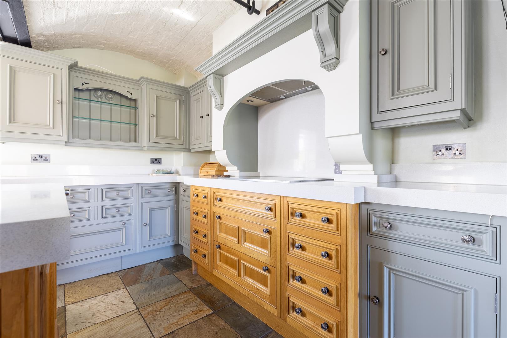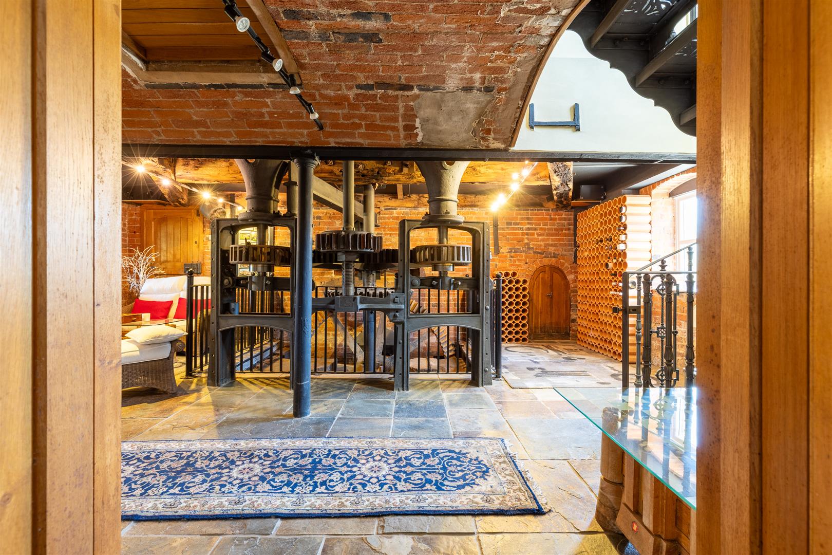 Dimensions: 7.54m x 6.48m (24'9" x 21'3"). A superb range of bespoke fitted furniture by Christians comprising floor standing cupboard and drawer units with Quartz worktops, wall cupboards, dresser unit with granite worktop, island unit with Quartz worktop, wine rack, integrated double Belfast sink with mixer tap and hot water tap, pantry cupboard, full height integrated refrigerator and freezer, Miele oven grill and induction hob with extractor hood above, barrelled ceiling, four double glazed windows, stone floor with underfloor heating, four double wall lights, exposed mill workings.