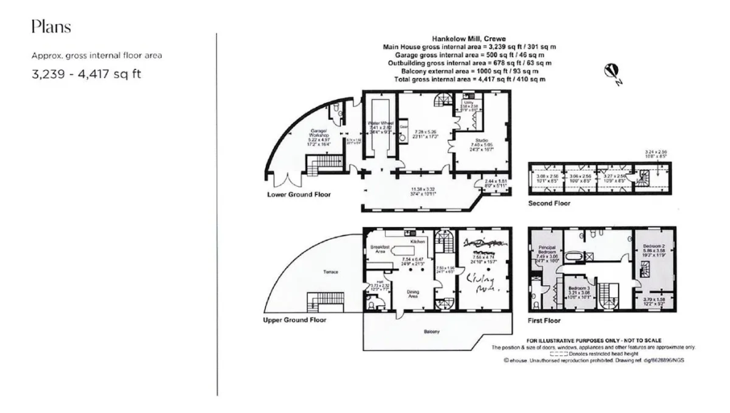 Terrace Hall, Cloakroom, Living Room, Kitchen/Breakfast/Dining Room, Hallway, Balcony, Principle Bedroom with Ensuite Shower Room, Bedroom No. 2 with Ensuite Dressing Room, Bedroom No. 3, Bathroom, Four Attic Rooms, Lower Ground Floor comprising Mill Room, Study, Utility Room, Waterwheel, Cupboard Balcony, Oil Central Heating, Double Glazed Windows, Workshop, Garage/Workshop, Car Parking and Turning Area, Garden and Grounds. About 3.25 Acres.
