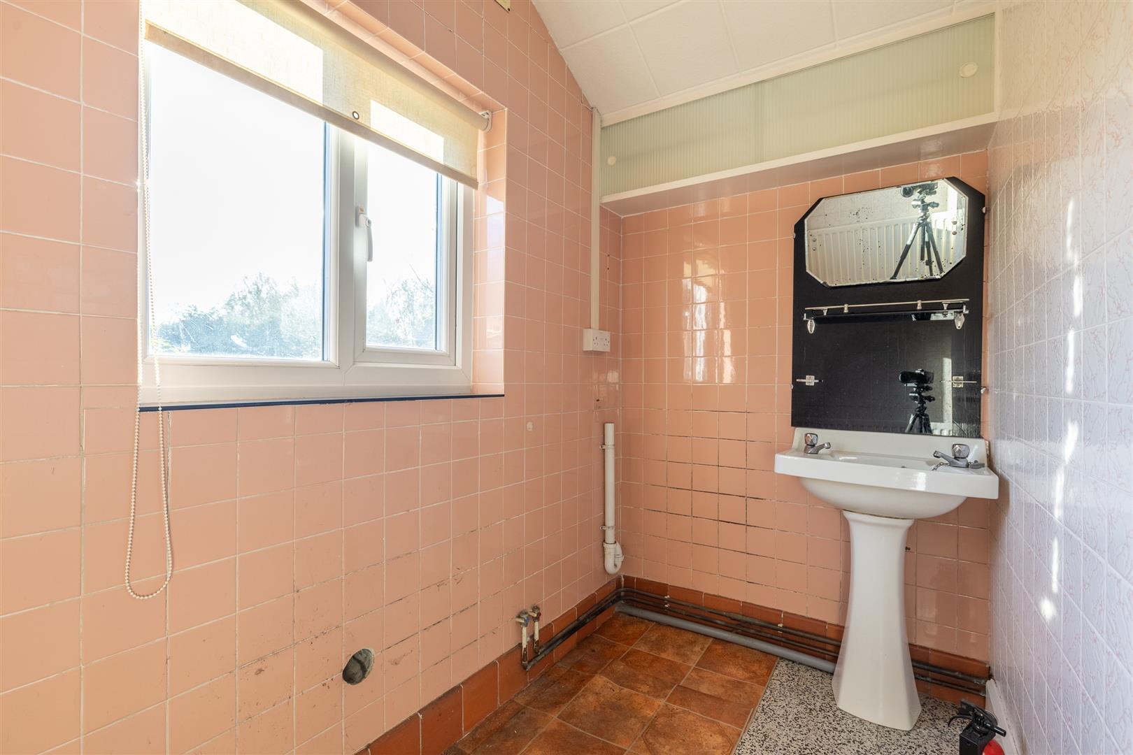 Dimensions: 2.57m x 2.18m (8'5" x 7'2"). Tiled floor, plumbing for washing machine, two double glazed windows, pedestal hand basin, tiled walls, separate W/C with low flush W/C.