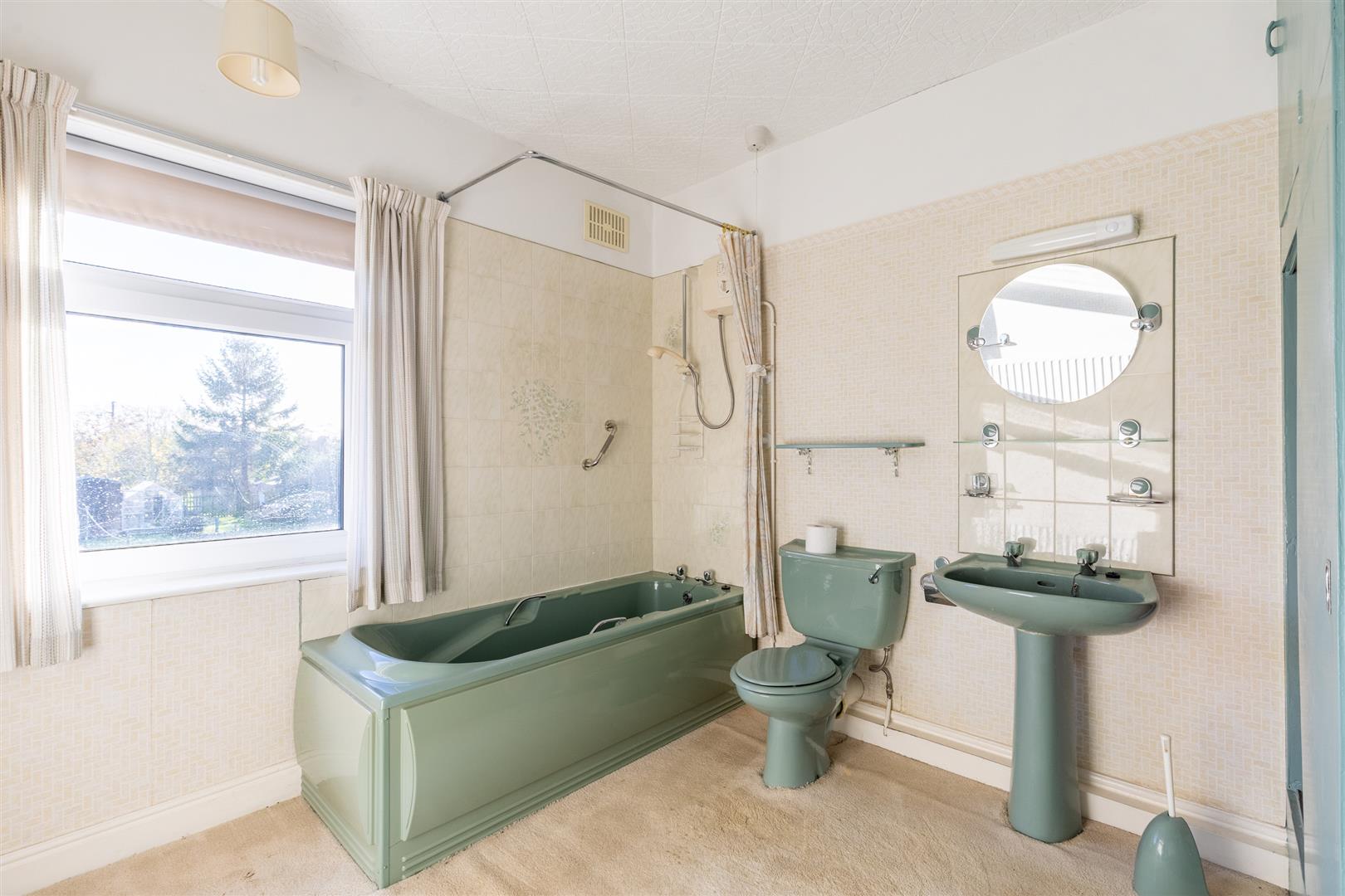 Dimensions: 3.02m x 2.82m (9'11" x 9'3"). Sage coloured suite comprising panel bath with Triton shower over, low flush W/C and pedestal hand basin, tiled around bath, cylinder and airing cupboard, radiator.