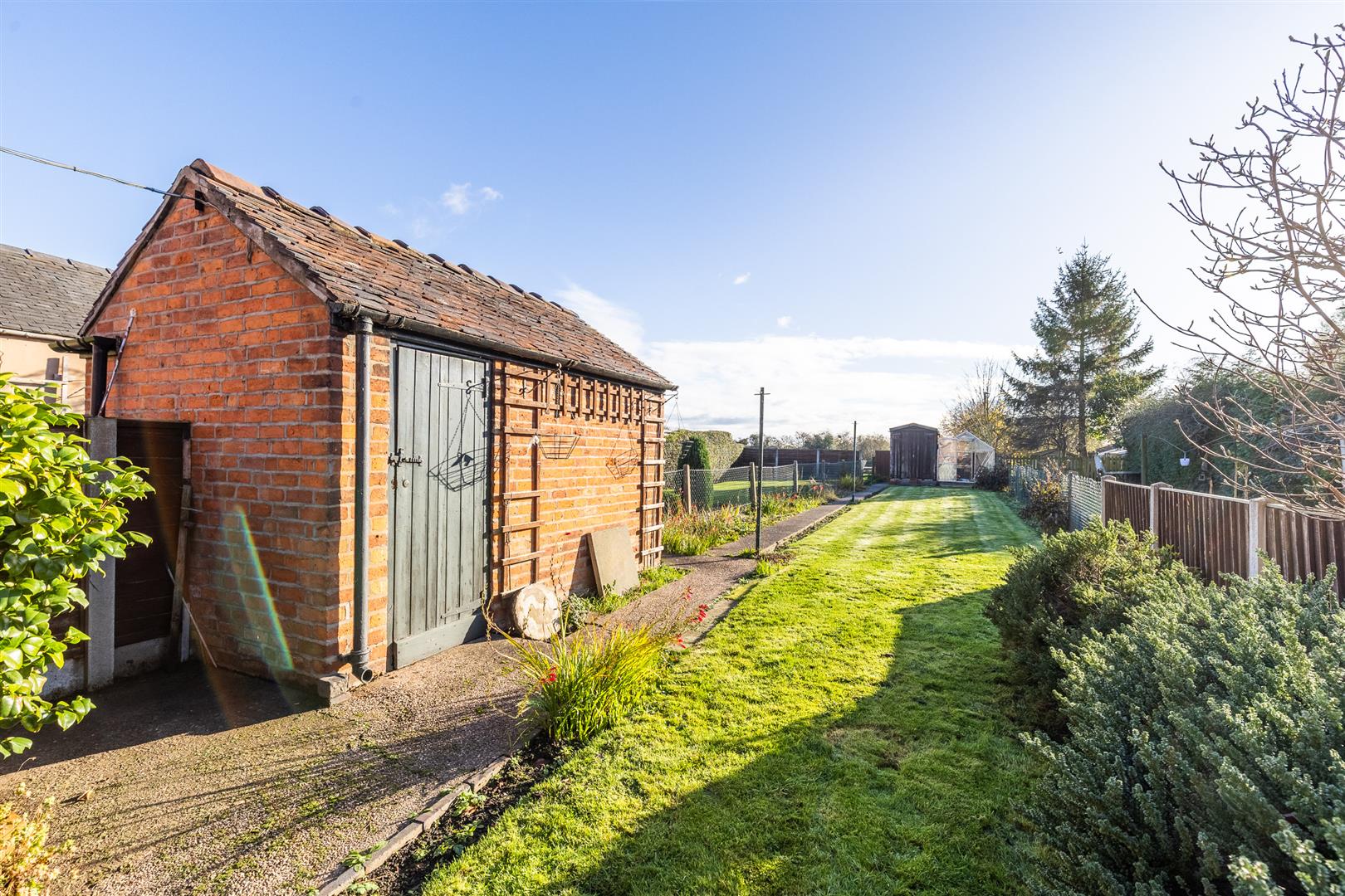 The garden is lawned with borders and specimen trees. The soil is fertile and has sustained vegetables and soft fruits over the years.