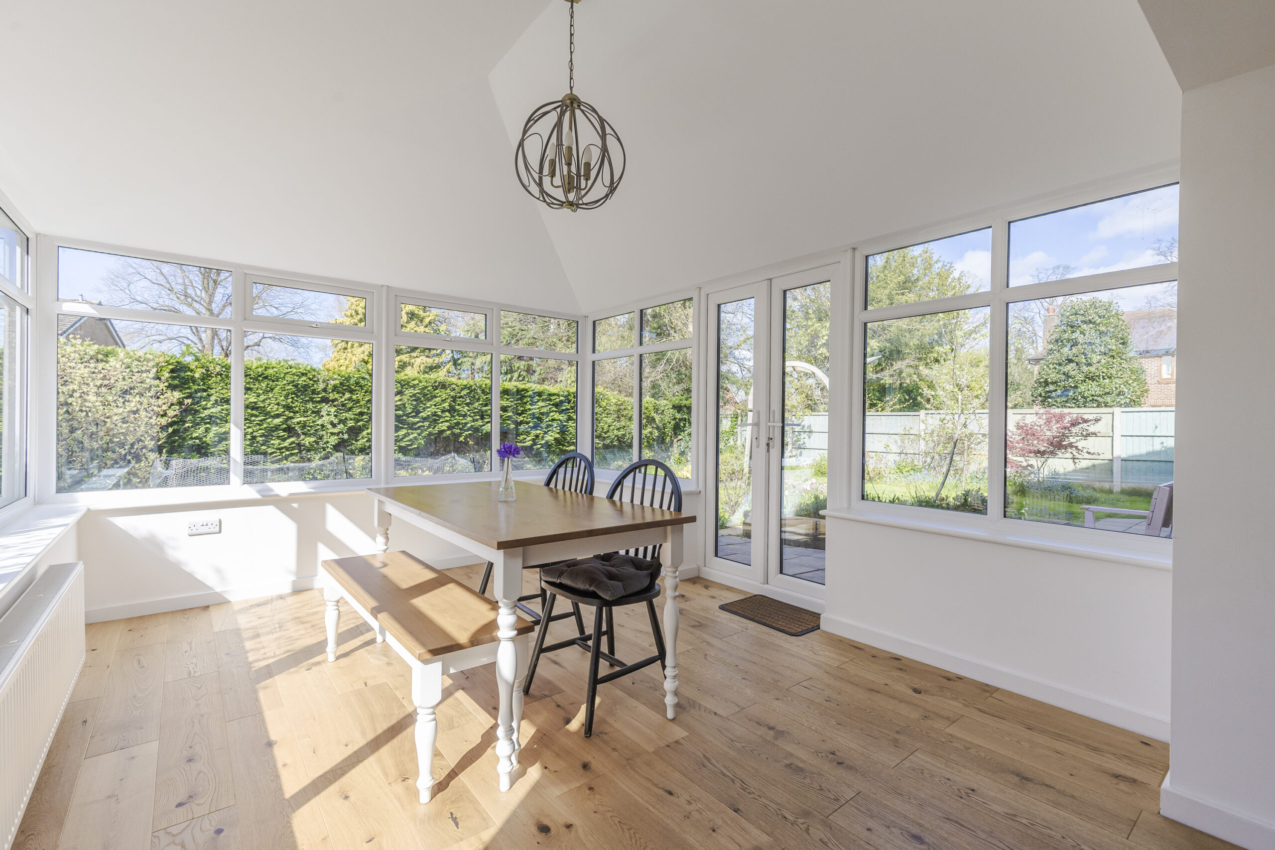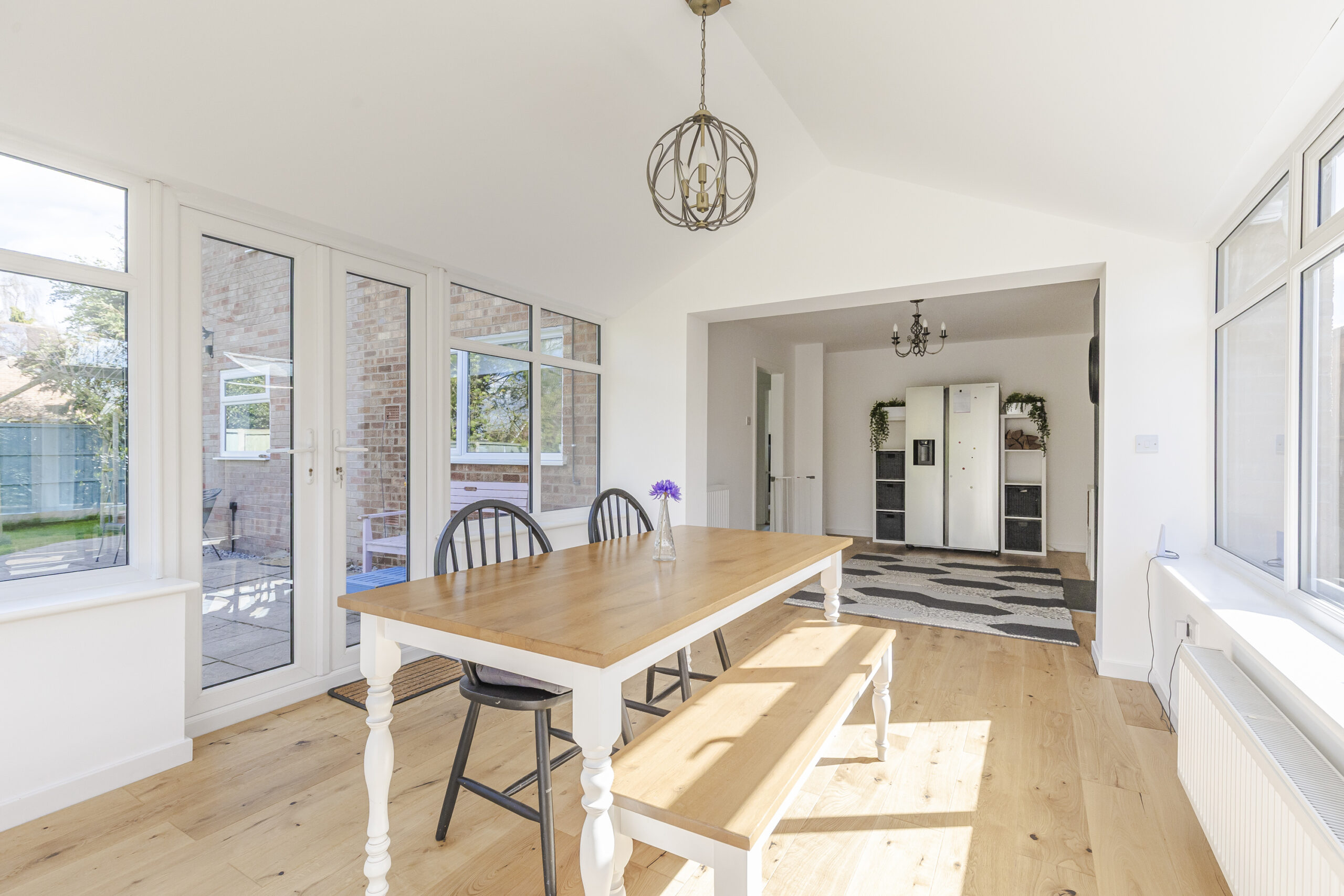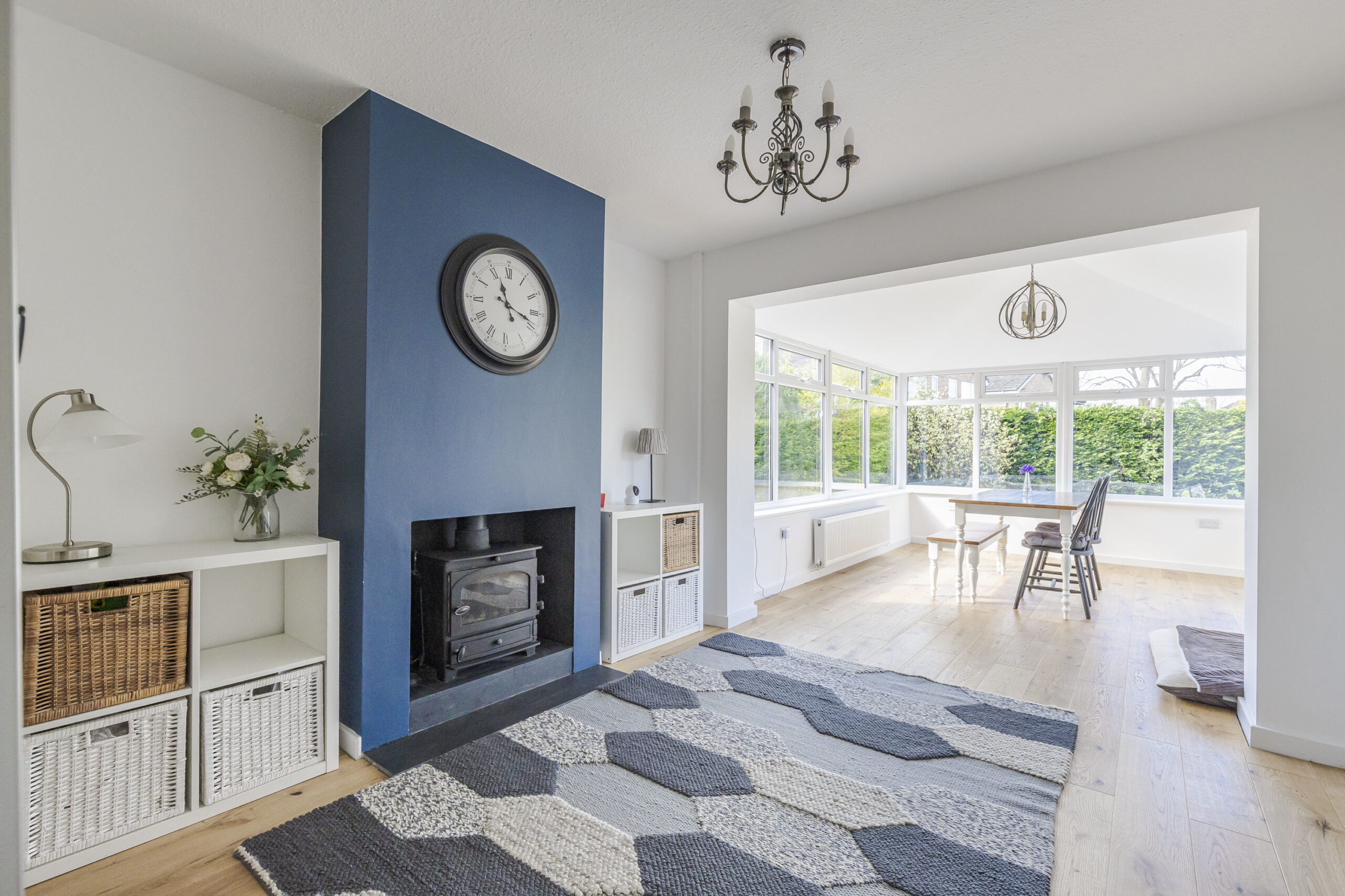 To the rear of the property is a second living room which opens into a bright orangery with windows on three sides and a log burner, creating an additional reception space. An inner hall off the kitchen provides access to a utility room, a downstairs bathroom with a three-piece suite, and a third reception room. This third living space could be used as an additional bedroom, offering potential for multi-generational living with its own access to the garden.