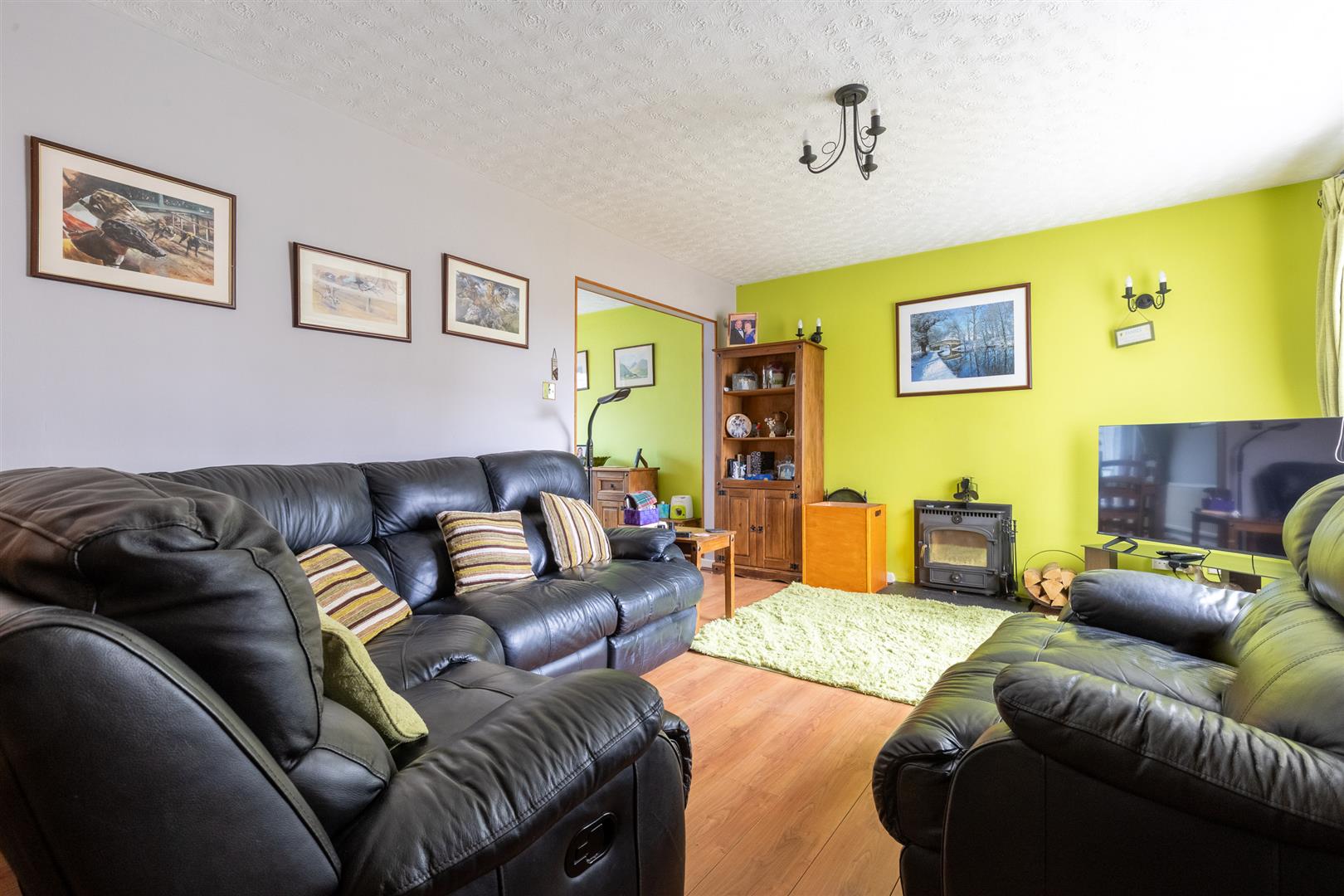 Dimensions: 5.44m x 3.58m (17'10" x 11'9"). Clearview Vision inset wood burning stove, understairs store, wood laminate floor, two double wall lights, radiator.