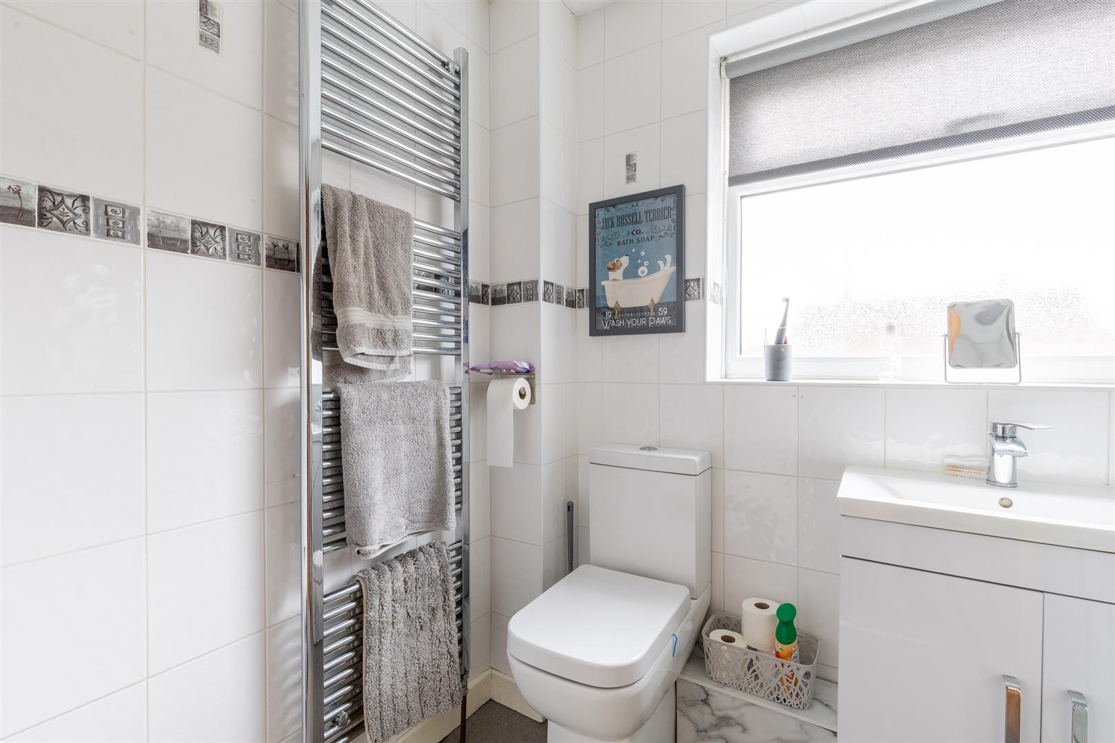 Dimensions: 2.39m x 1.68m (7'10" x 5'6"). Refitted in 2021, white suite comprising low flush W/C, vanity unit with inset hand basin, shower cubicle with Triton shower, fully tiled walls, bathroom cabinet, non slip flooring, chrome radiator/towel rail.