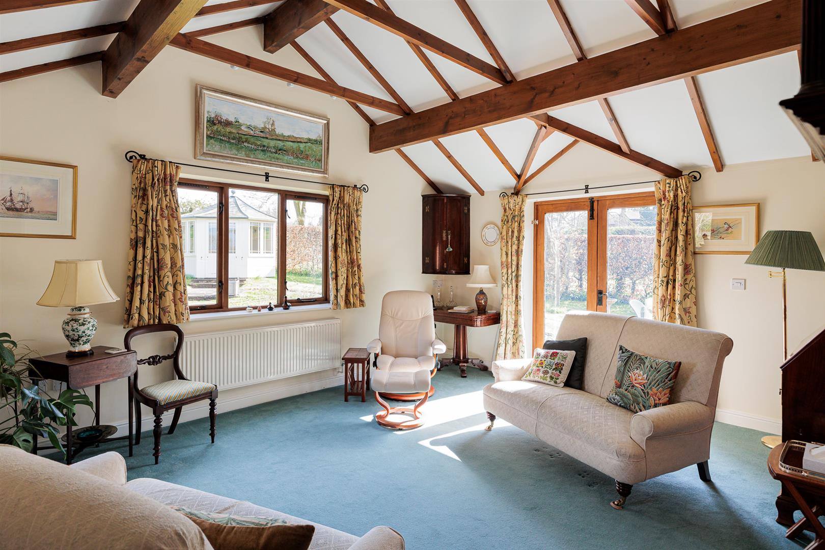 Dimensions: 5.03m x 4.11m (16'6" x 13'6"). Vaulted beamed ceiling, two double glazed windows and double glazed windows to patio, two radiators.