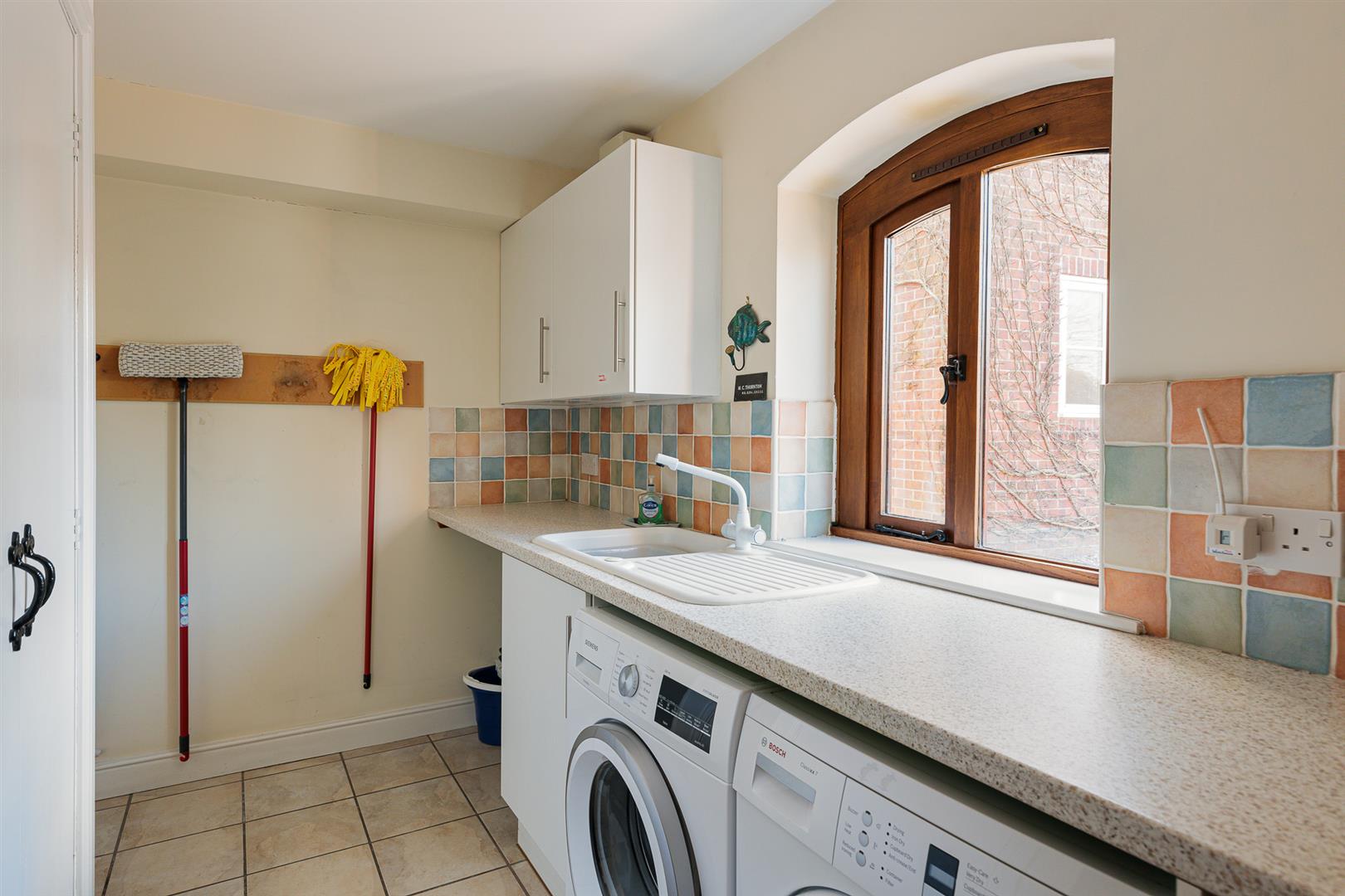 Dimensions: 3.58m x 2.13m (11'9" x 7'0"). Single drainer sink unit, cupboard under, wall cupboards, space under worktop and plumbing for washing machine and tumbler dryer, radiator.