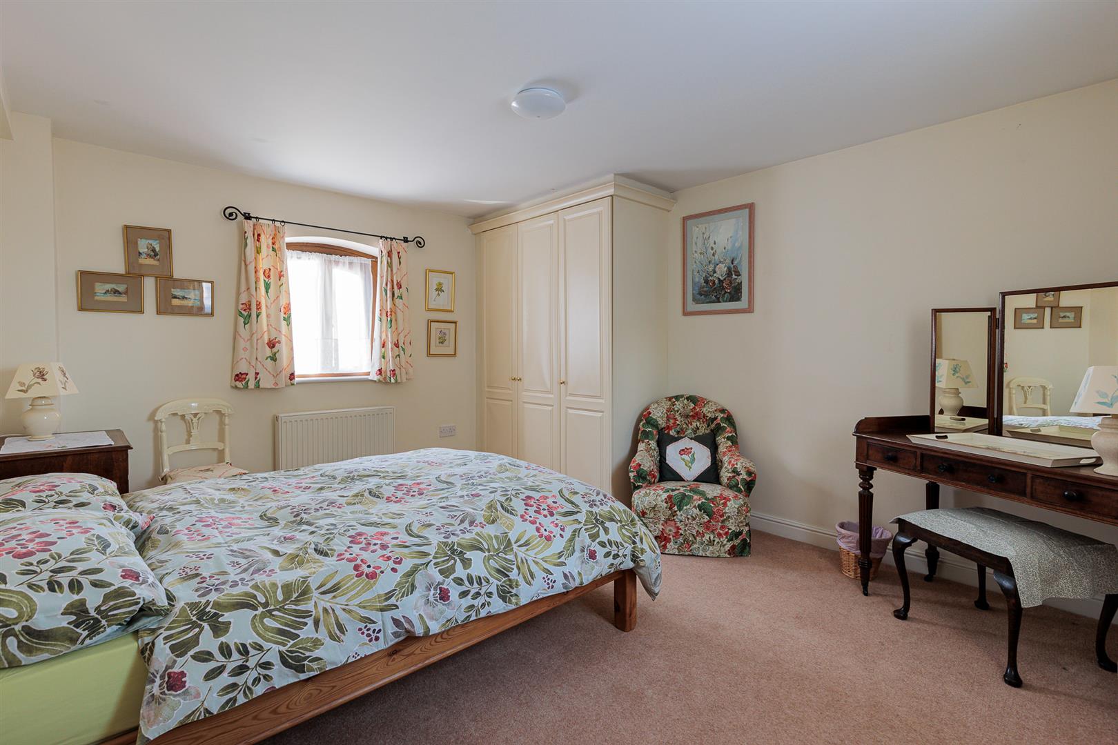 Dimensions: 4.37m x 3.51m (14'4" x 11'6"). Fitted furniture comprising two double wardrobes, two dressing tables, two bedside cabinets, cupboards and shelving, vaulted beamed ceiling, double glazed window and double glazed round window, two radiators.