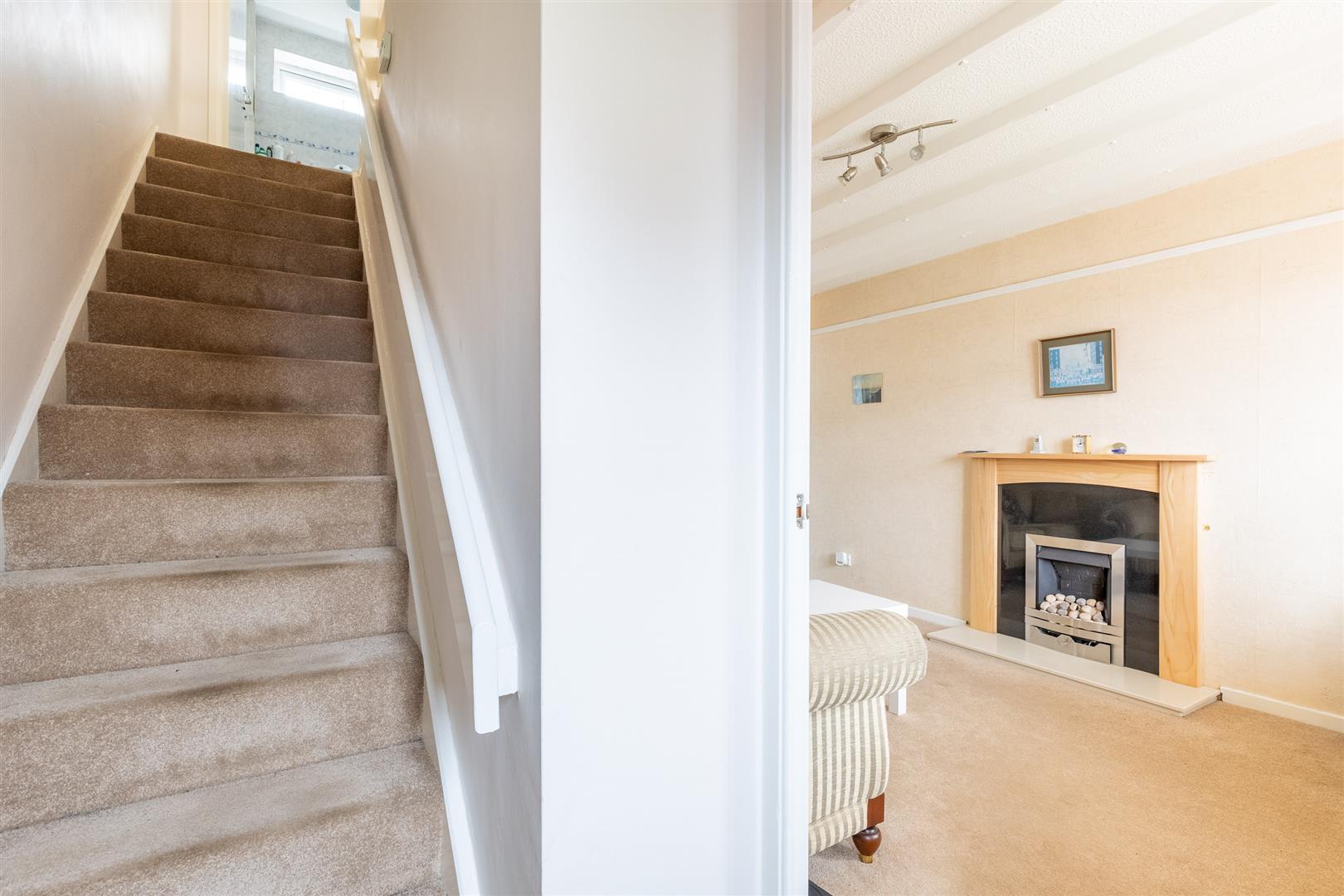 The entrance hall includes a radiator, carpeted flooring, and ceiling light, with access to understairs storage. The living room is positioned to the front with a bay window, carpeted flooring, radiator, gas fireplace (installed two years ago), and light fitting. The kitchen, located at the rear, features matching wall and base units beneath a work surface, plumbing for a washing machine, space for fridge/freezer, four-ring gas hob with oven below, sink, tiled flooring, part tiled walls, radiator, and ceiling light. There is a rear aspect double glazed window and patio doors opening onto the garden.