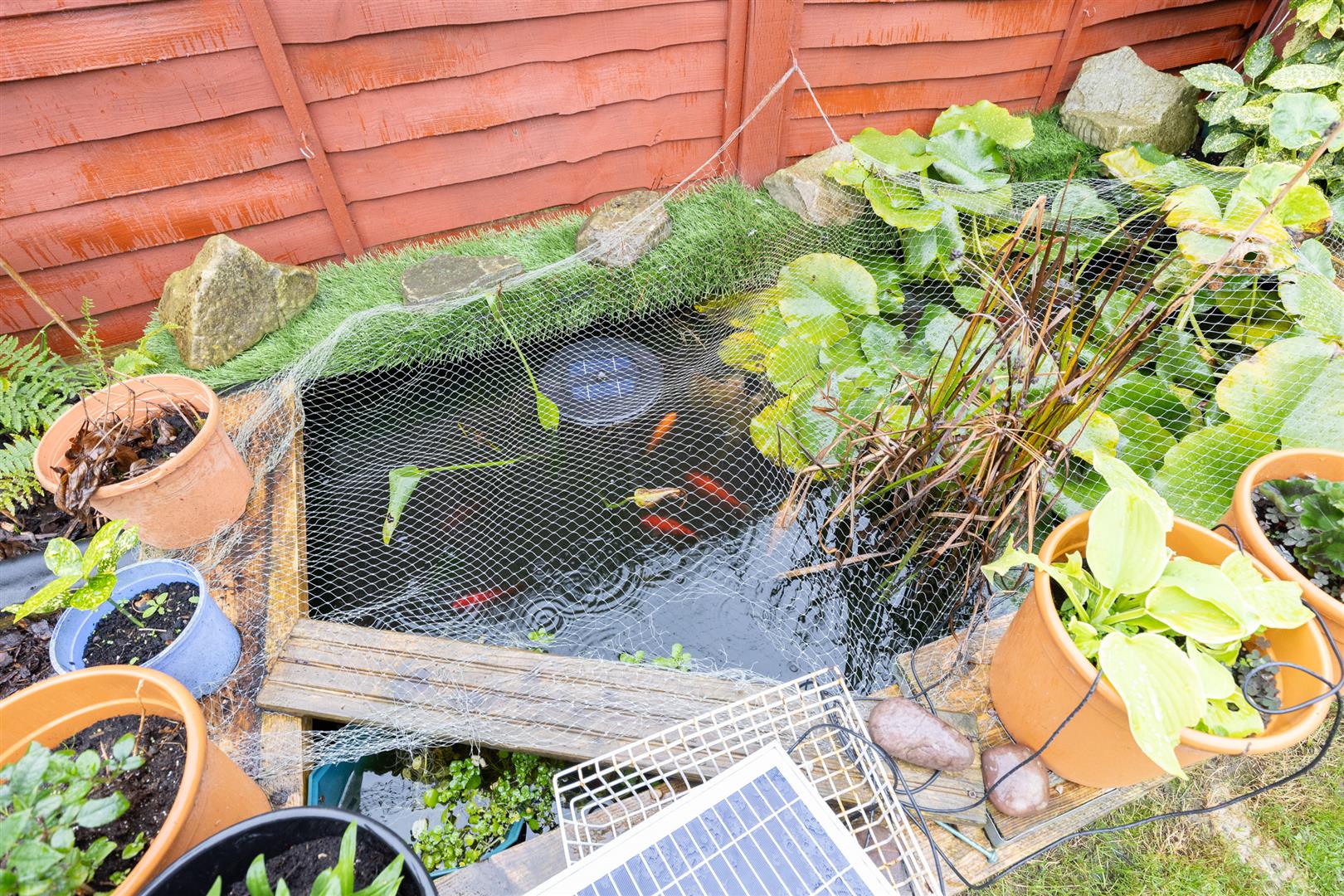 The south-east facing rear garden includes a large patio, lawn, greenhouse, and above-ground pond. The garden is enclosed by fencing and mature borders, with an outside tap.