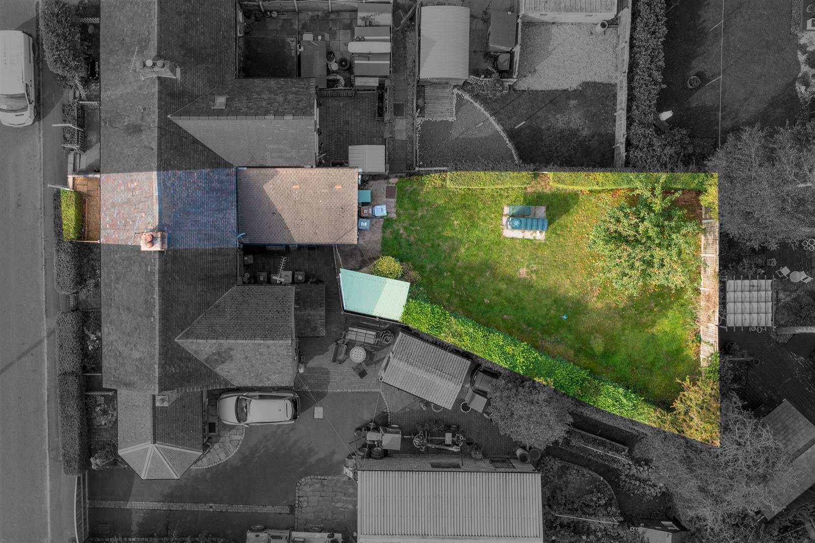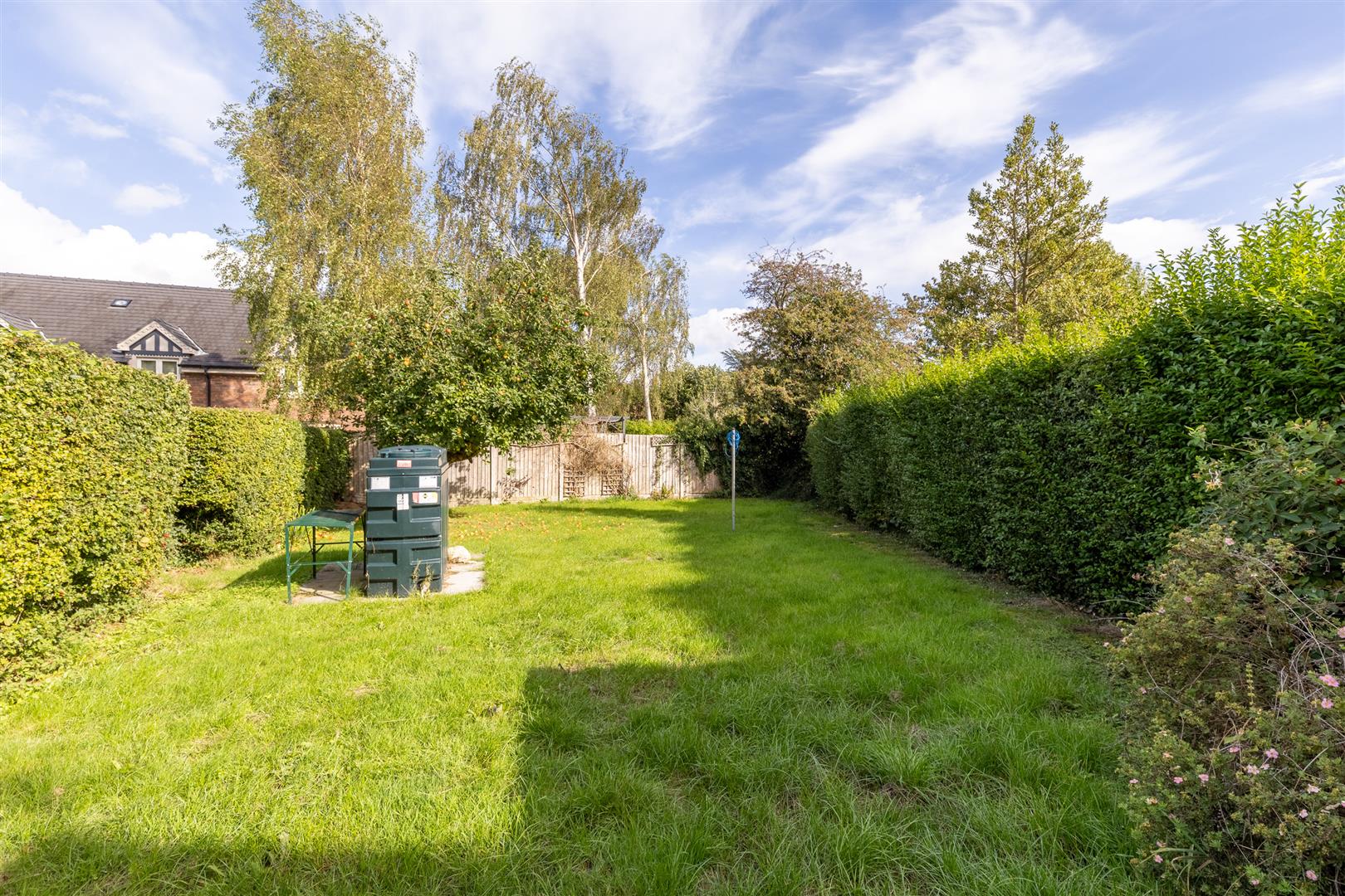 Front stoned garden with paved pathway, gate and holly hedge, Rear garden -brick built outhouse store, Navien exterior combination oil fired boiler, side gate to pedestrian access for bins etc, expansive rear lawn, oil storage tank, apple tree.
