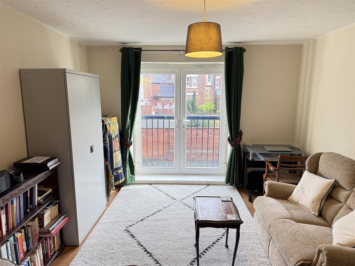 The entrance opens into a spacious open-plan kitchen and living area, providing an ideal space for modern living and dining. The room benefits from multiple windows allowing plenty of natural light. The kitchen is fitted with a range of units and work surfaces, with space for appliances and ample storage. There are two generous double bedrooms, each offering space for furniture and storage. The family bathroom features a panelled bath, separate shower cubicle, wash hand basin, and low flush W/C.