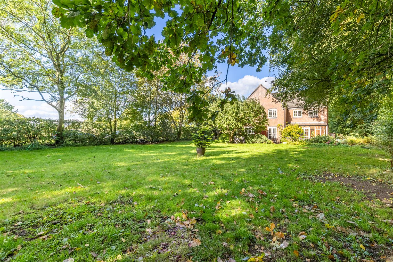 Dimensions: 4.90m x 2.79m (16'1" x 9'2"). Spacious master bedroom with en-suite and dressing area, offering picturesque views of the rear garden and woodlands.