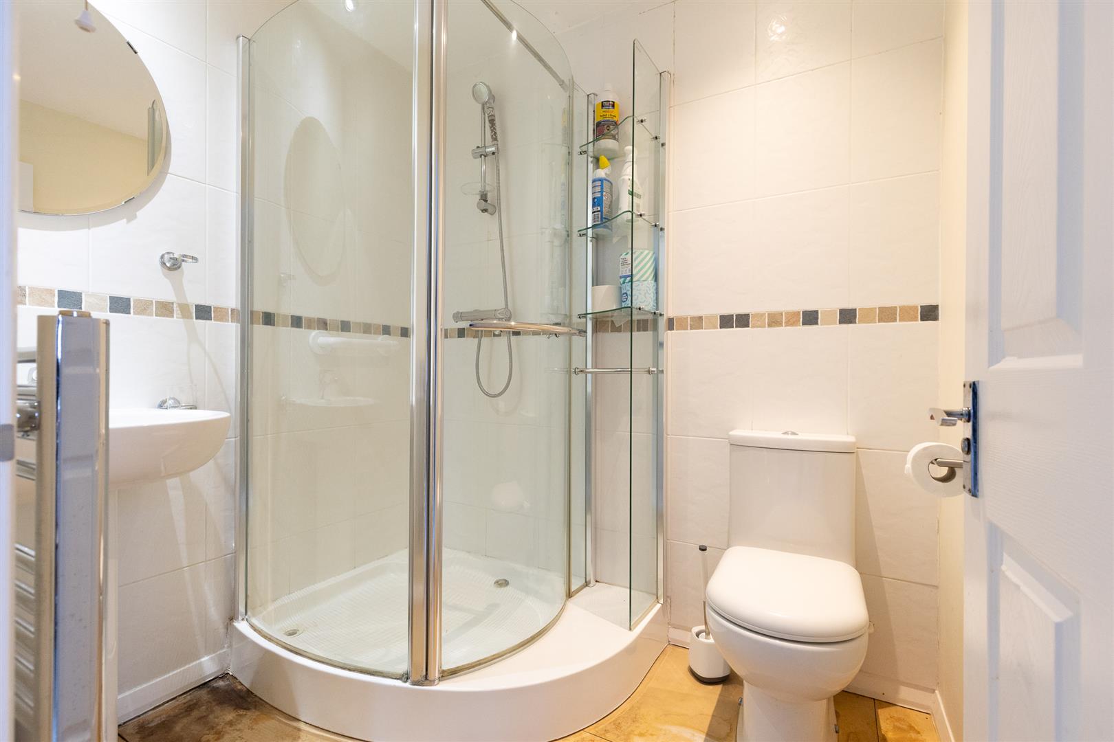 Dimensions: 1.96m x 1.60m (6'5" x 5'3"). Corner screen door enclosed cubicle with thermostatic shower., pedestal wash hand basin, close coupled WC. Chrome heated towel radiator. Part tiled walls.