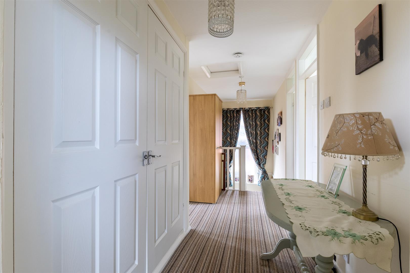 See attached plan. Front off road parking to expansive concrete pattern driveway. Standing on a generous corner plot, with a widening lawned rear garden having a variety of shrubs and trees. Paved patio and pathways to side pedestrian gate. Timber summer house and storage shed.. Adjoining the school recreational playing fields to provide a delightful open setting. Integral single garage (7’11” x 16’10”) - up-and-over door. Side personal door and side window.