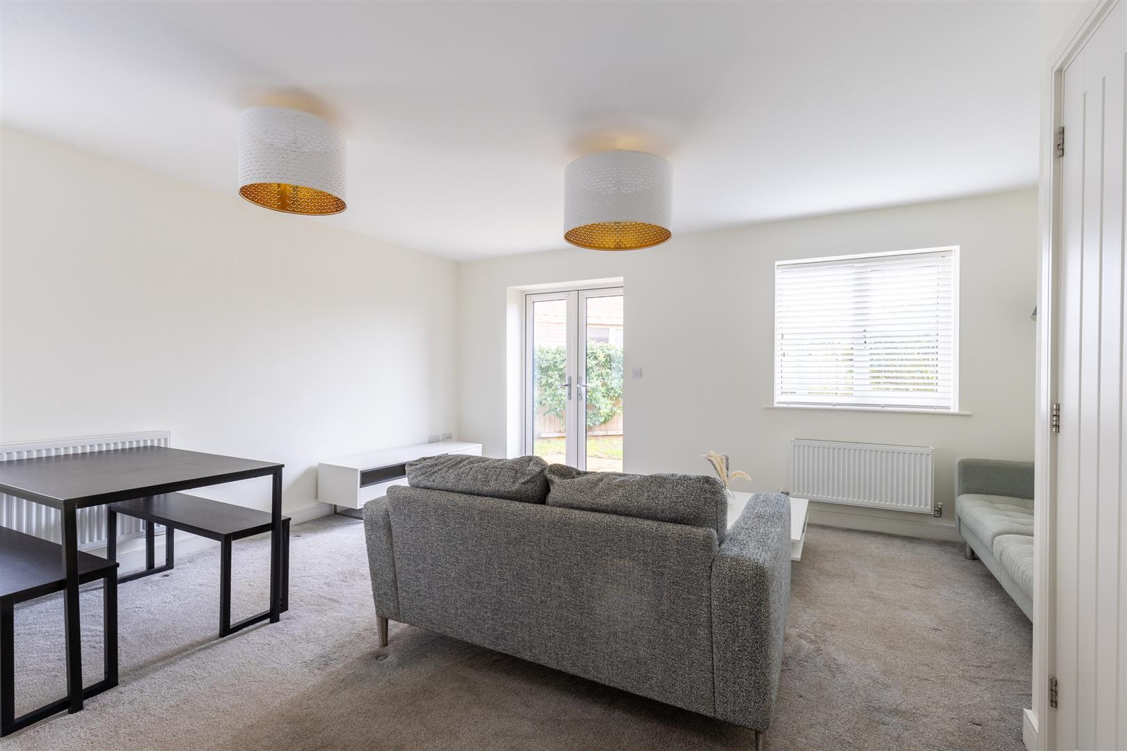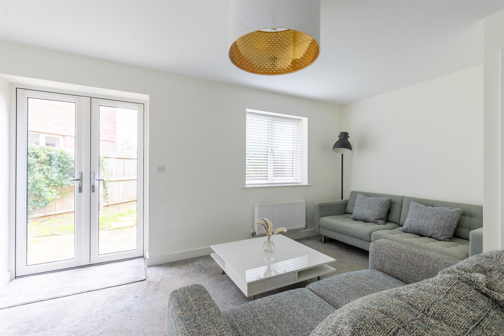 Dimensions: 5.28m x 4.72m (17'4" x 15'6"). Two double glazed windows, double glazed French windows to rear garden, understairs store, open to kitchen, two radiators.