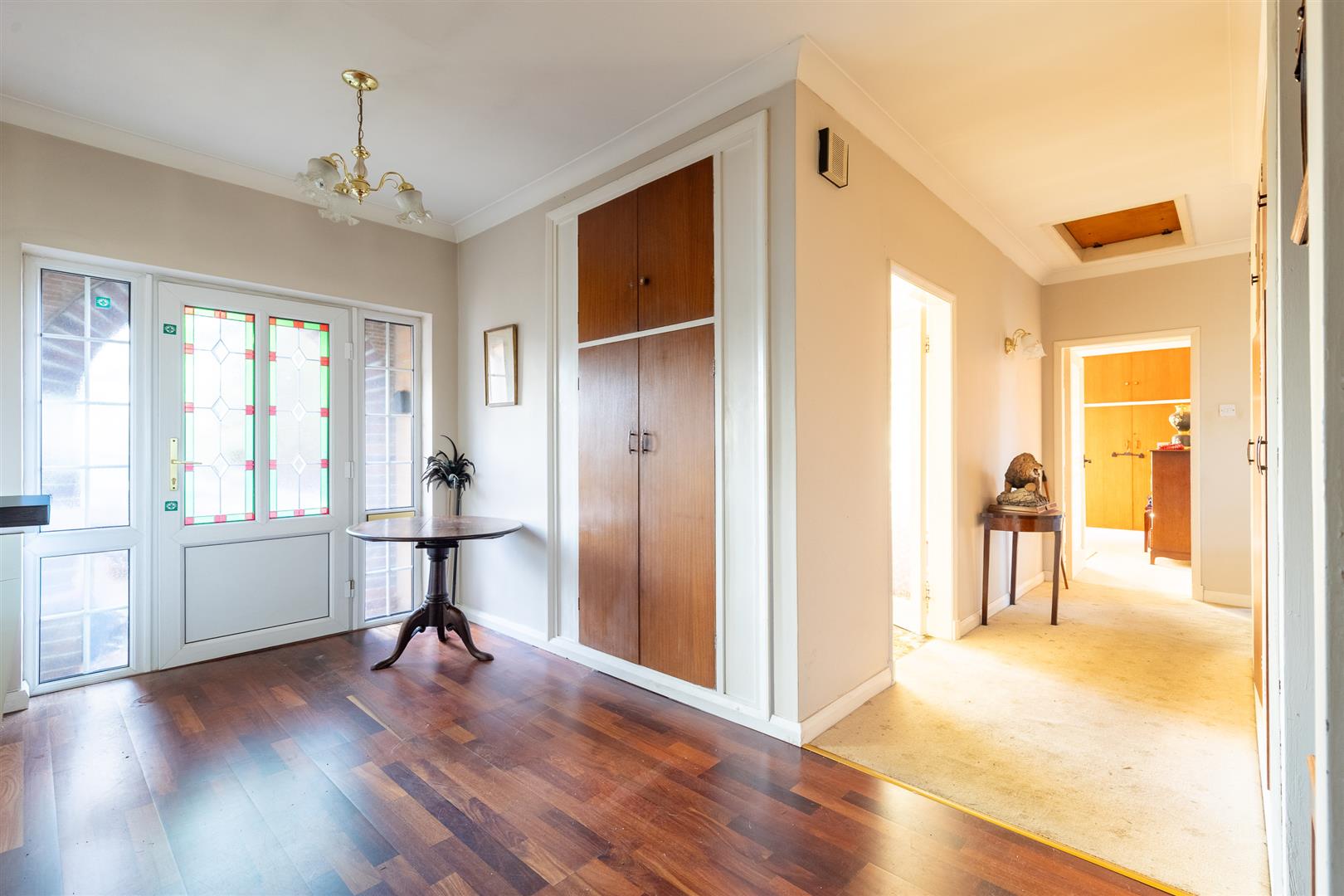 Dimensions: 6.32m x 4.27m (20'9" x 14'0"). uPVC entrance door, cloaks cupboard, ceiling cornices, wood strip floor, radiator.