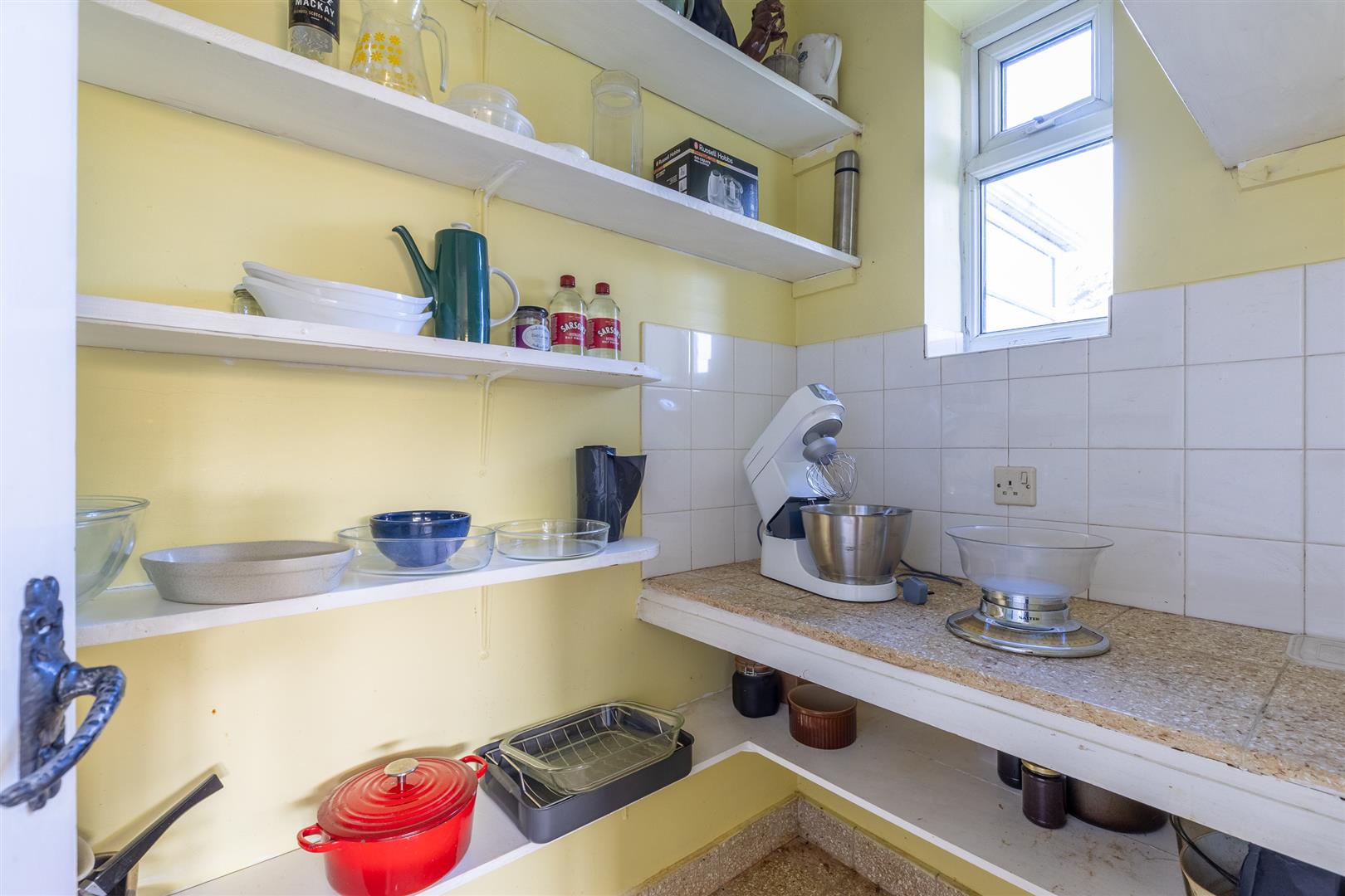 Dimensions: 1.85m x 1.19m (6'1" x 3'11"). With cold slab, shelving, tiled floor and double glazed window.