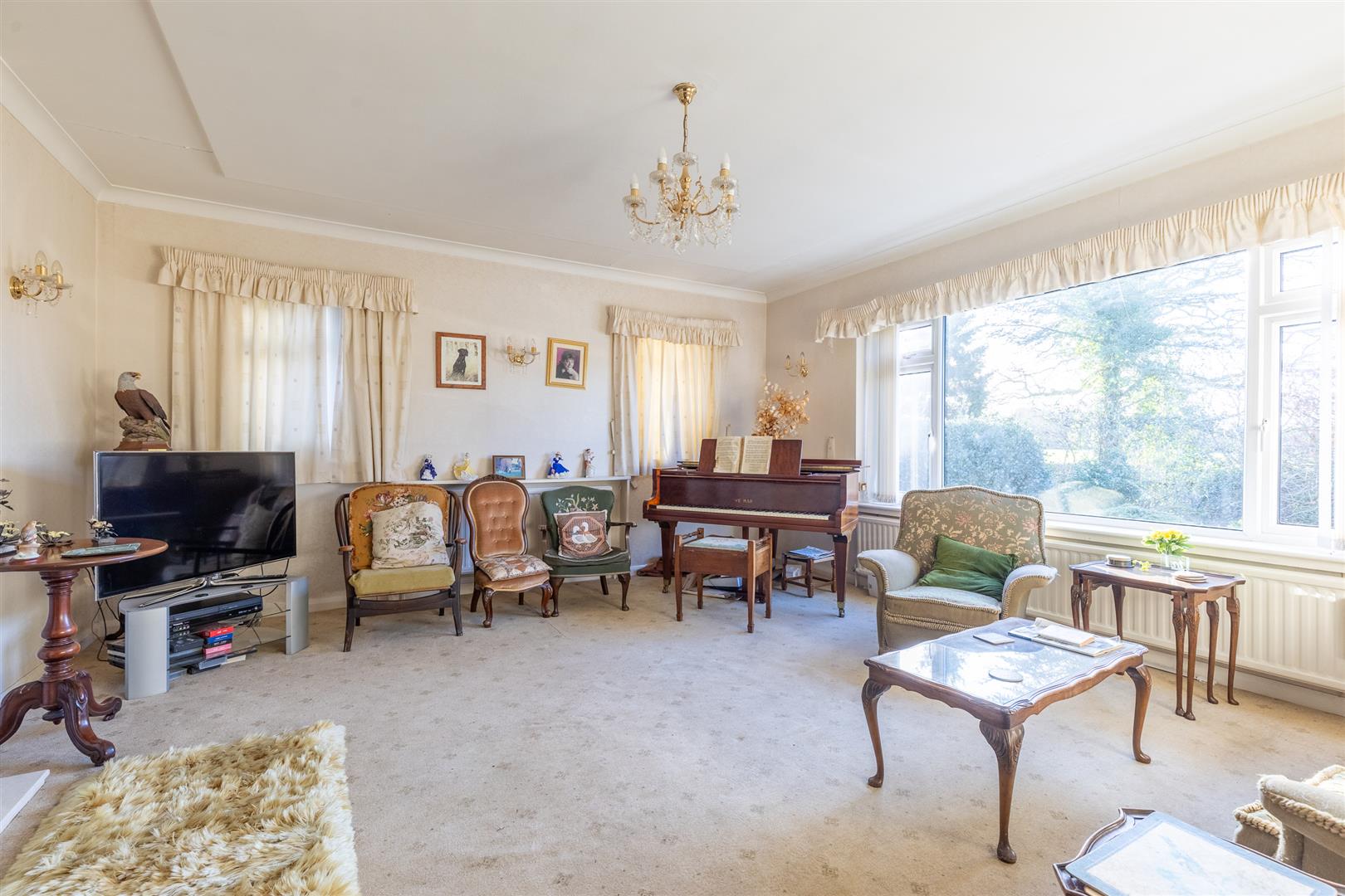 Dimensions: 5.31m x 5.28m (17'5" x 17'4"). Marble fireplace with living flame coal effect gas fire, five double wall lights, three double glazed windows, two radiators.