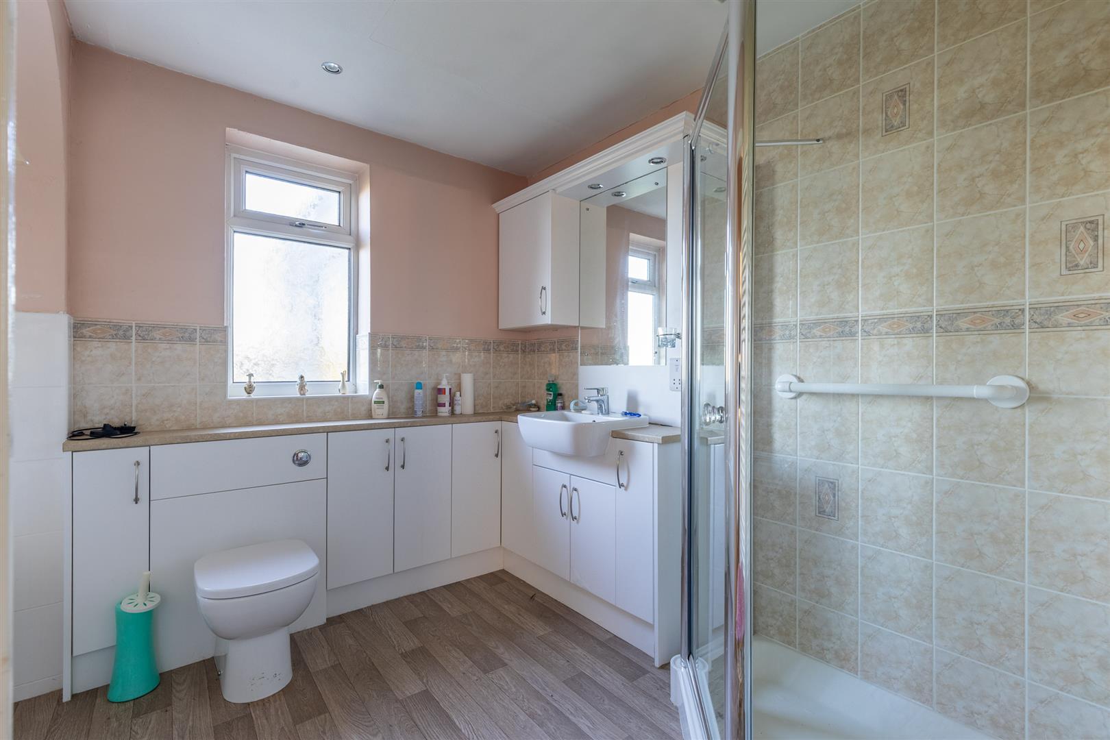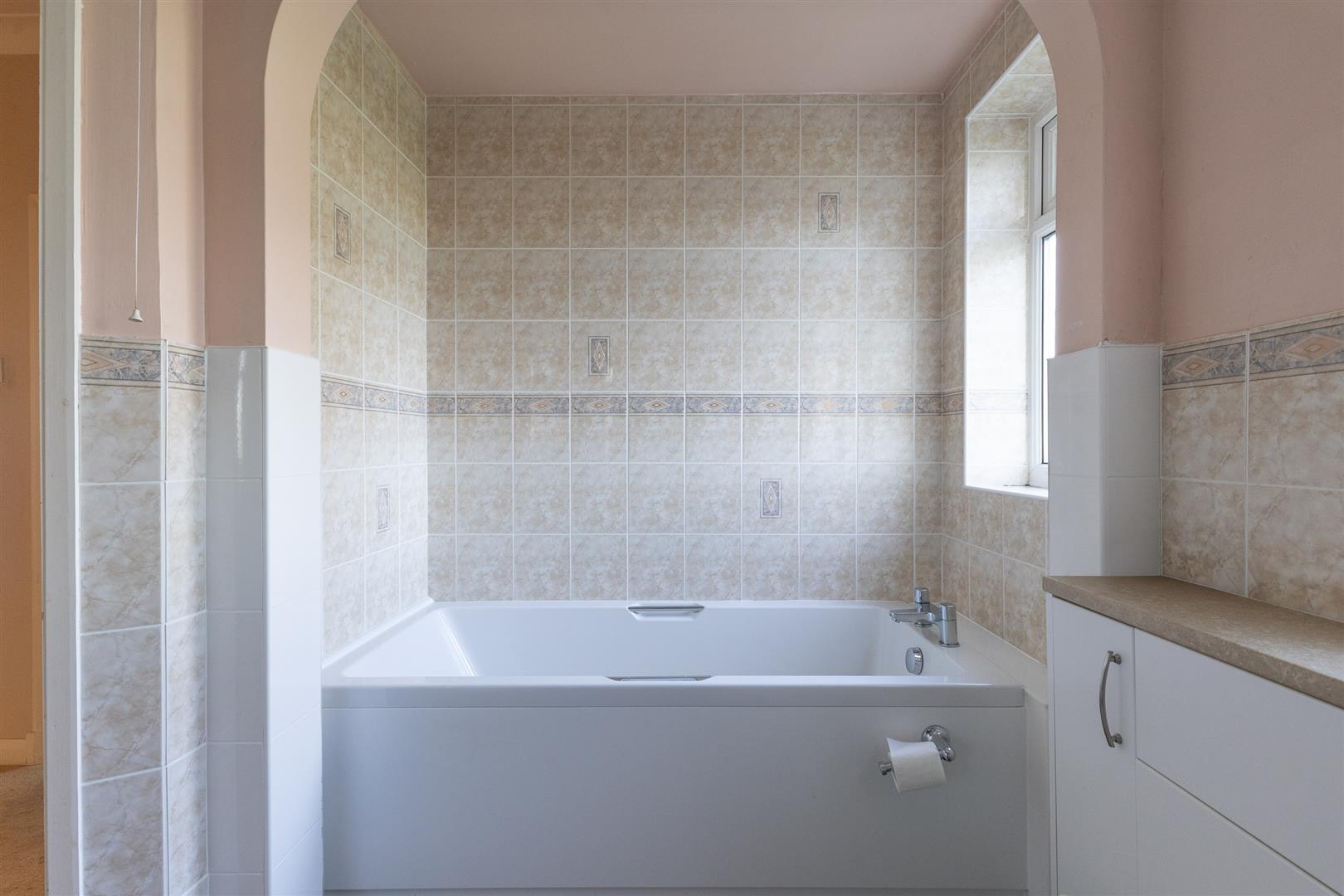 Dimensions: 3.02m x 2.67m (9'11" x 8'9"). Modern white suite comprising panel bath, low flush W/C and vanity unit with inset hand basin, fully tiled around bath, tiled shower cubicle with thermostatic shower and jets, mirror fitting, fitted cupboard, shaver point, radiator/towel rail