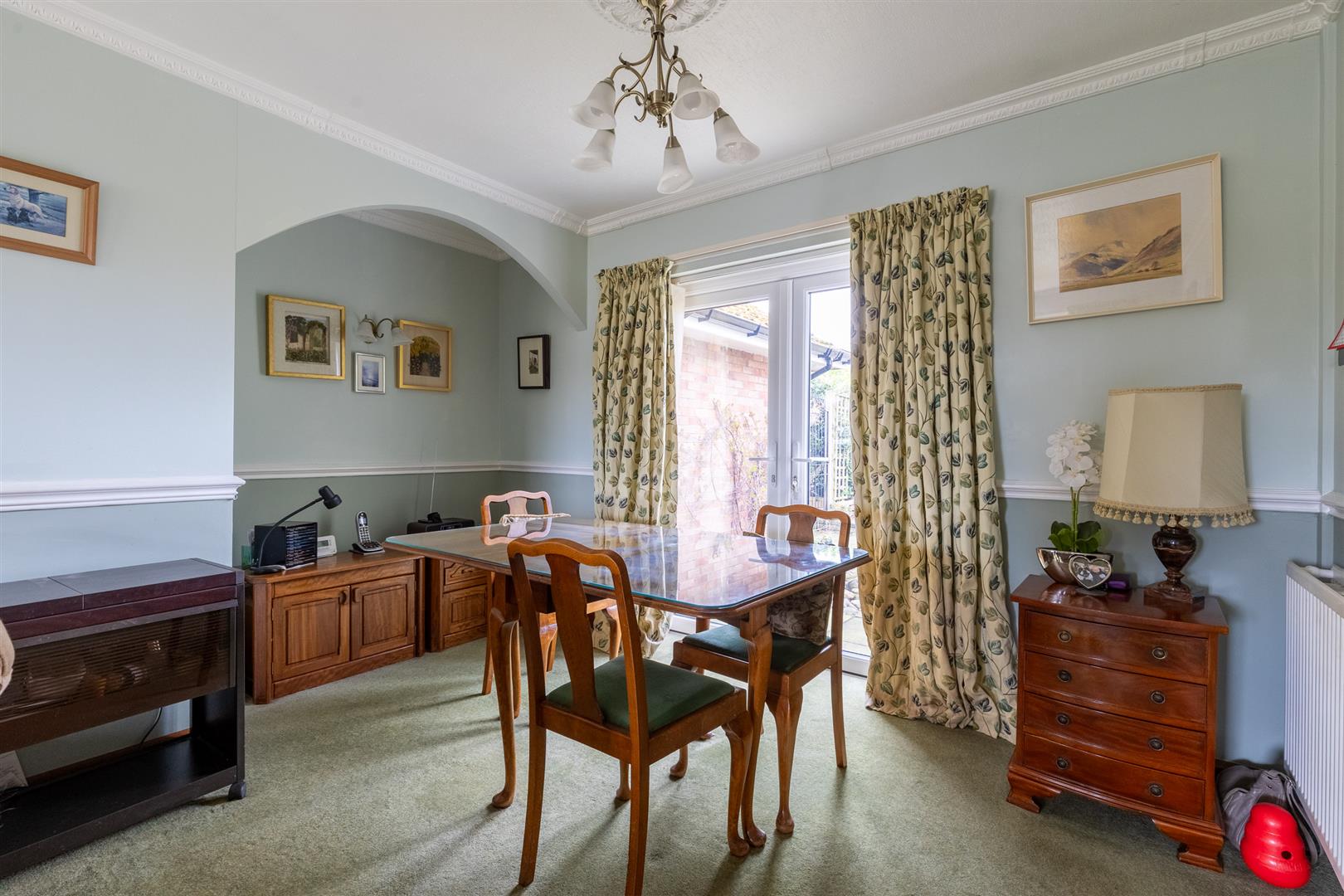 Dimensions: 24'3 x 13'0. Marble fireplace with timber surround and living flame coal effect gas fire, feature dining alcove, double glazed window to front and double glazed French windows to rear, two double wall lights, ceiling cornices, dado rail, two radiators.