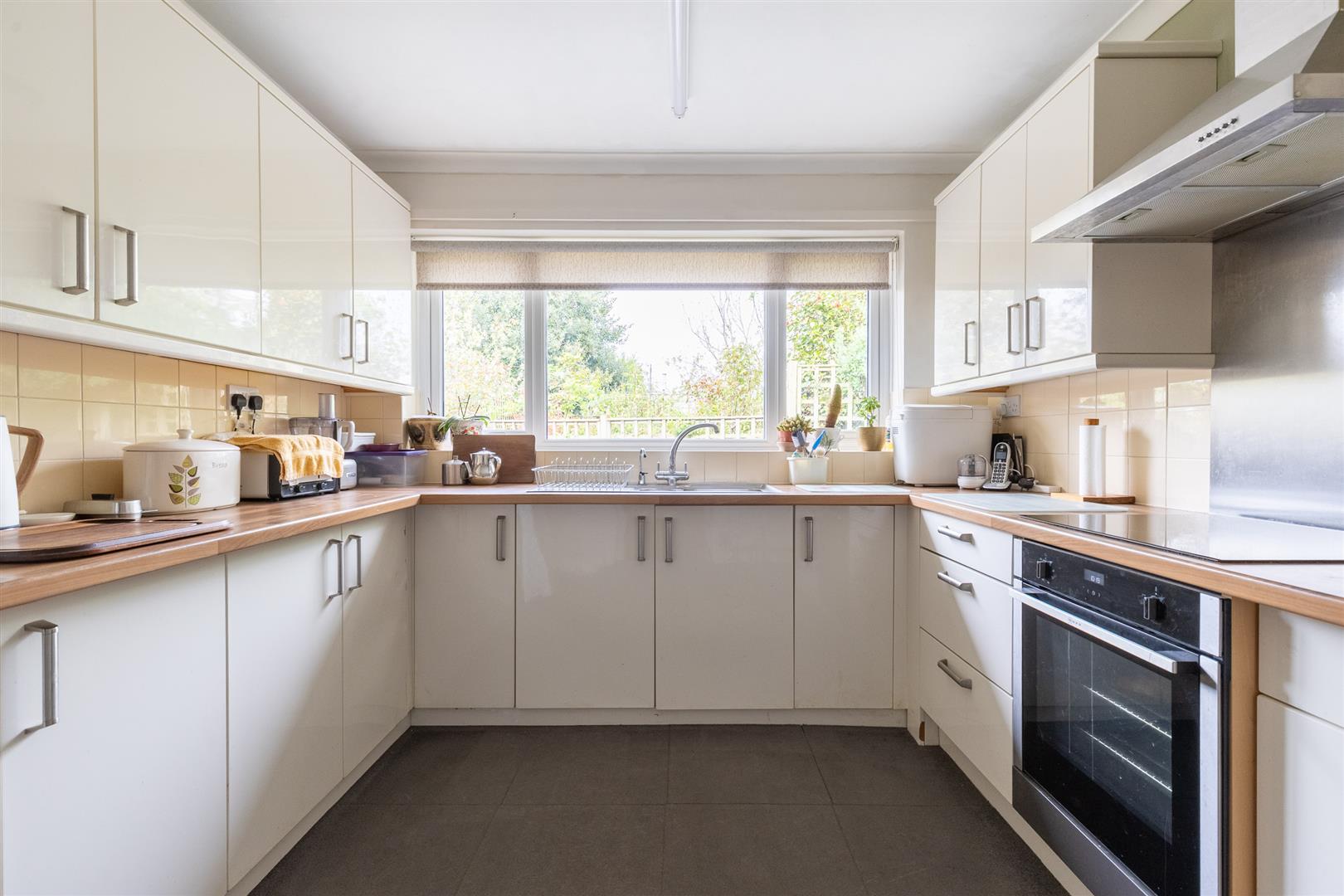 Dimensions: 12'10" x 9'10. Refitted in 2015, stainless steel one and half bowl single drainer sink unit, cupboards under, floor standing cupboard and drawer units with worktops, wall cupboards, Neff integrated oven with extractor hood above, door to garage, tiled floor, radiator.