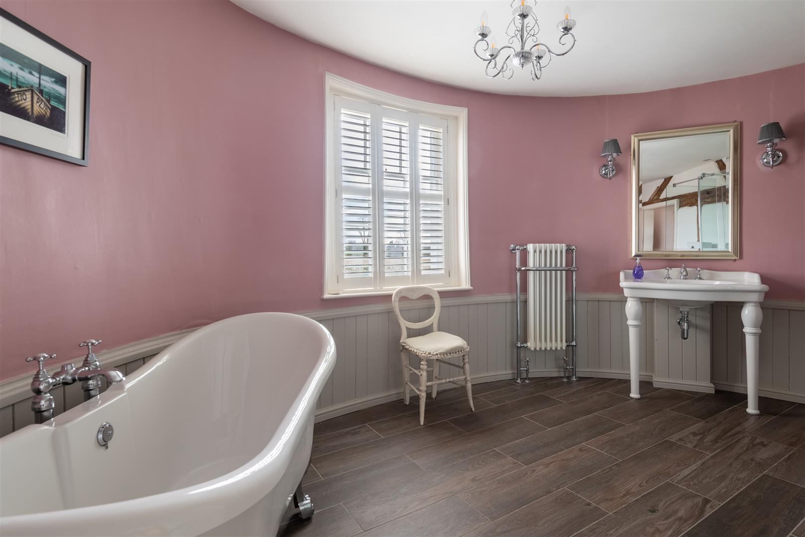 Dimensions: 4.09m x 2.87m (13'5" x 9'5"). White suite comprising free standing bath with ball and claw feet and mixer shower, pedestal hand basin and low flush W/C, panel walls to dado, two windows, tiled floor, cast iron fire grate, two single wall lights, period style radiator/towel rail, built in cupboard.