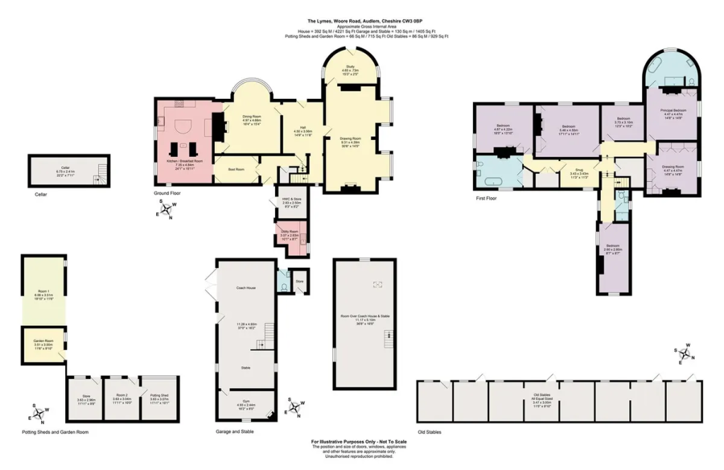Reception Hall, Inner Staircase Hall, Drawing Room, Study, Dining Room, Kitchen/Breakfast Room, Boot Room, Rear Hall, Cellar, First Floor Landing, Principle Bedroom Suite comprising Bedroom, Dressing Room and Bathroom, Four Further Double Bedrooms, Snug, Shower Room, Bathroom, Outside Utility Room and Store, Oil Fired Central Heating, Coach House Building with Room Above, Timber Range of Buildings, Timber Range of Eight Stables, Car Parking Space, Gardens, About One Acre.