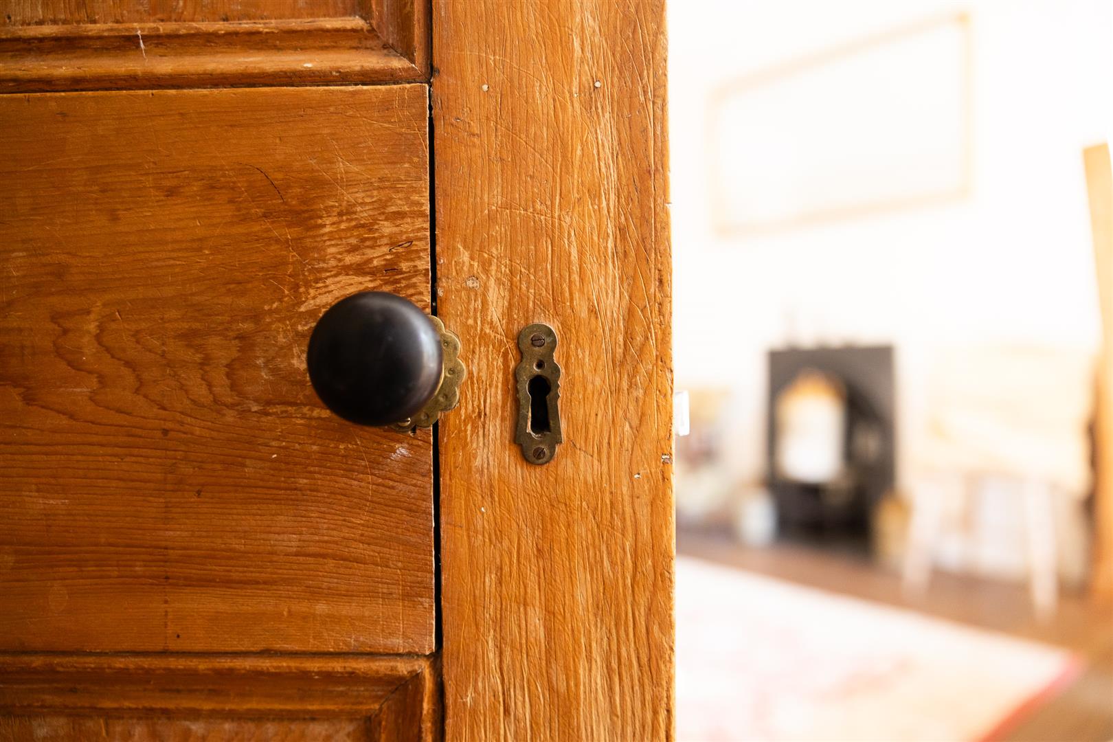 Glazed, double opening. Exterior doors. Impressive wide pine glazed interior door with etched glass and coloured inserts plus complementary side windows.