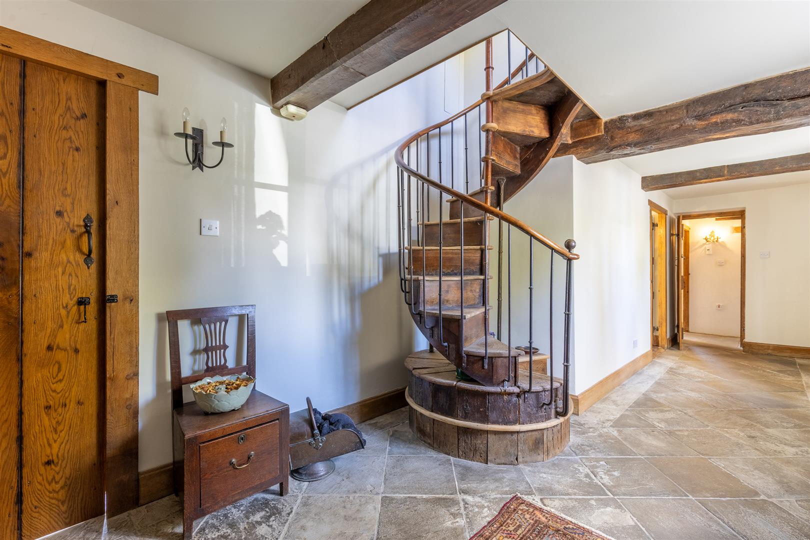 Dimensions: 7.59m x 2.77m reducing to 1.55m (24'11" x 9'1" red. Two staircases to first floor including the beautiful feature French 18th Century spiral staircase with stunning black walnut crafted handrail and elm treads, Yorkshire tiled floor in the style of the local church floor St Mary's, attractive sold oak exterior door, radiator.