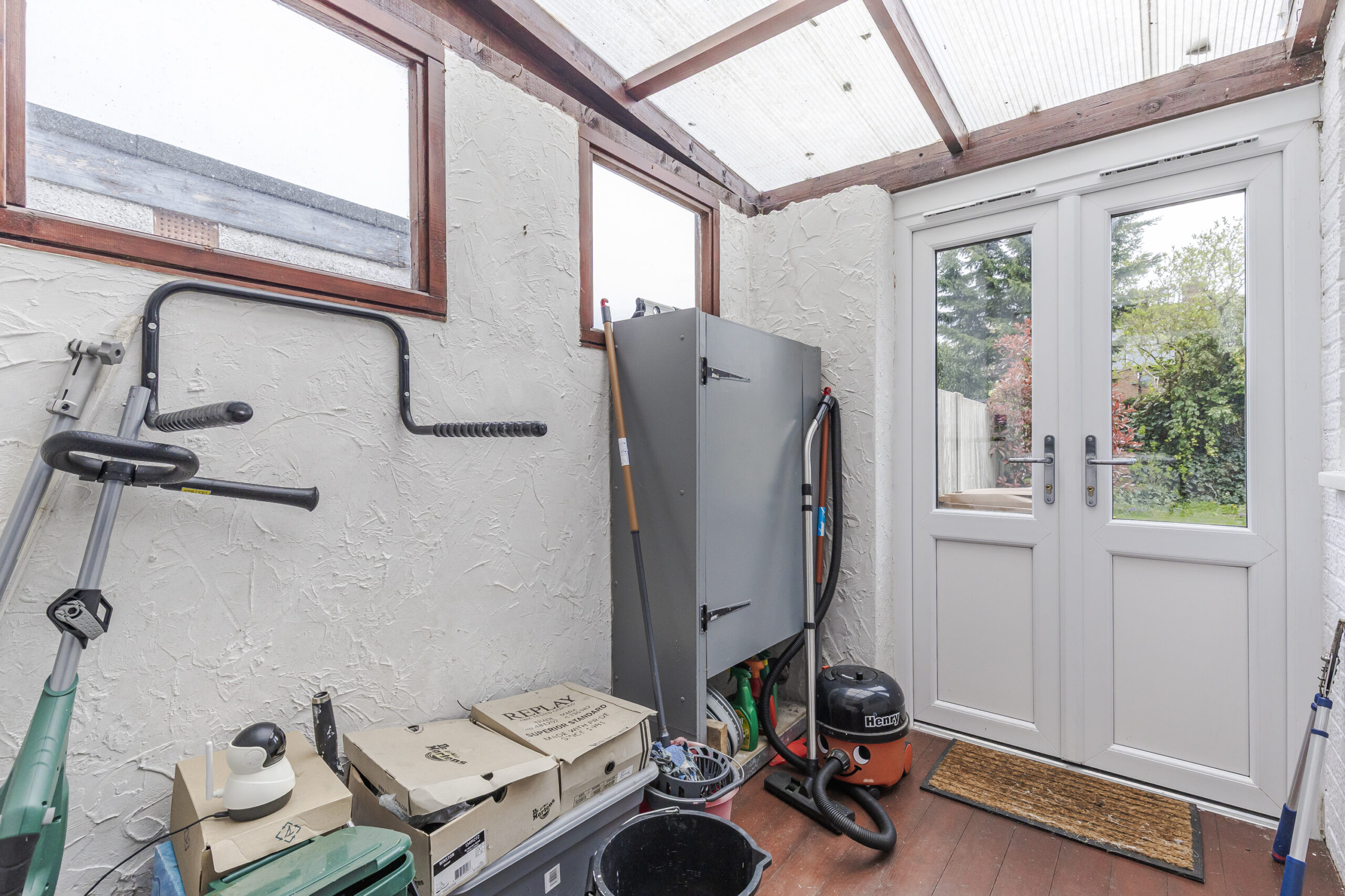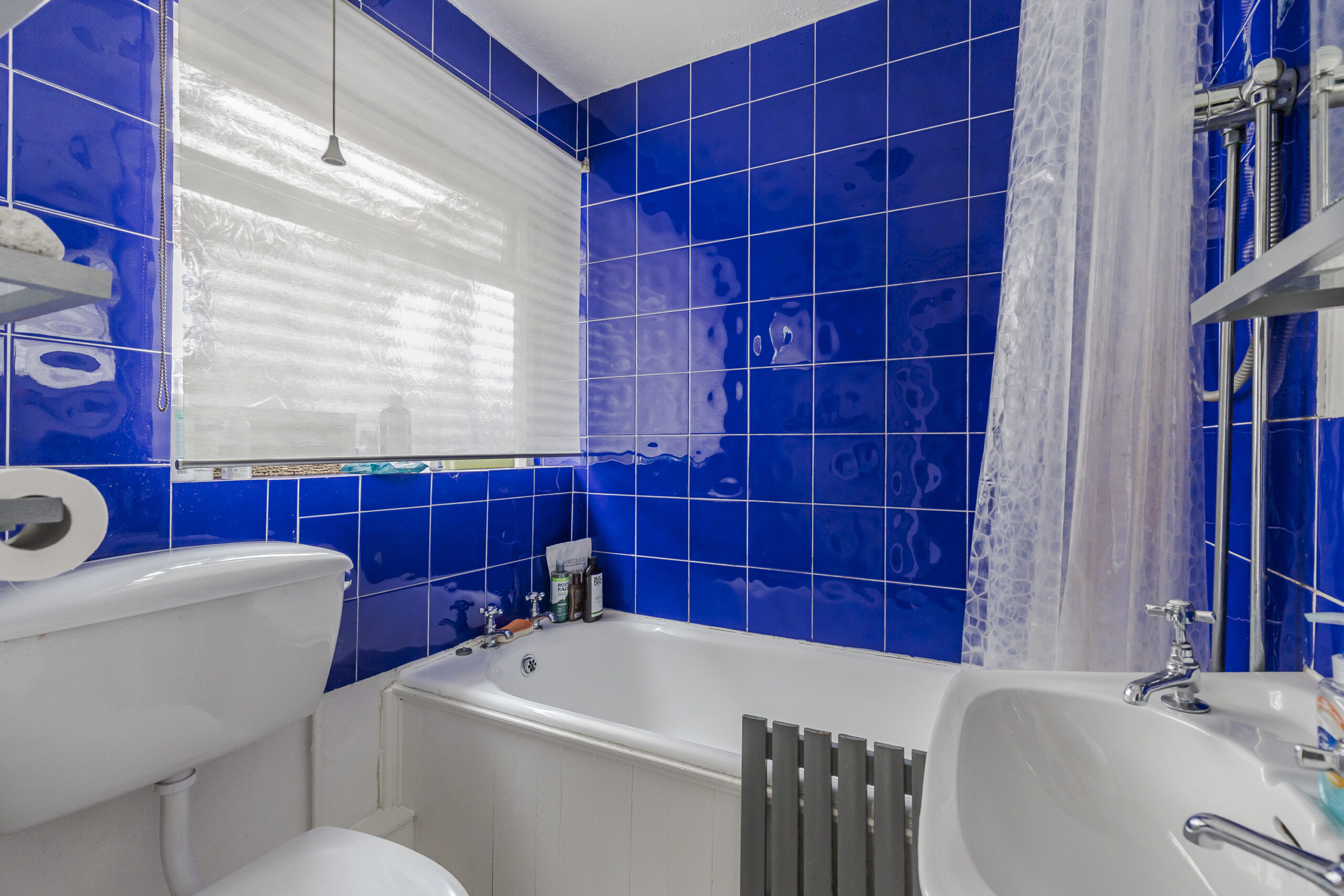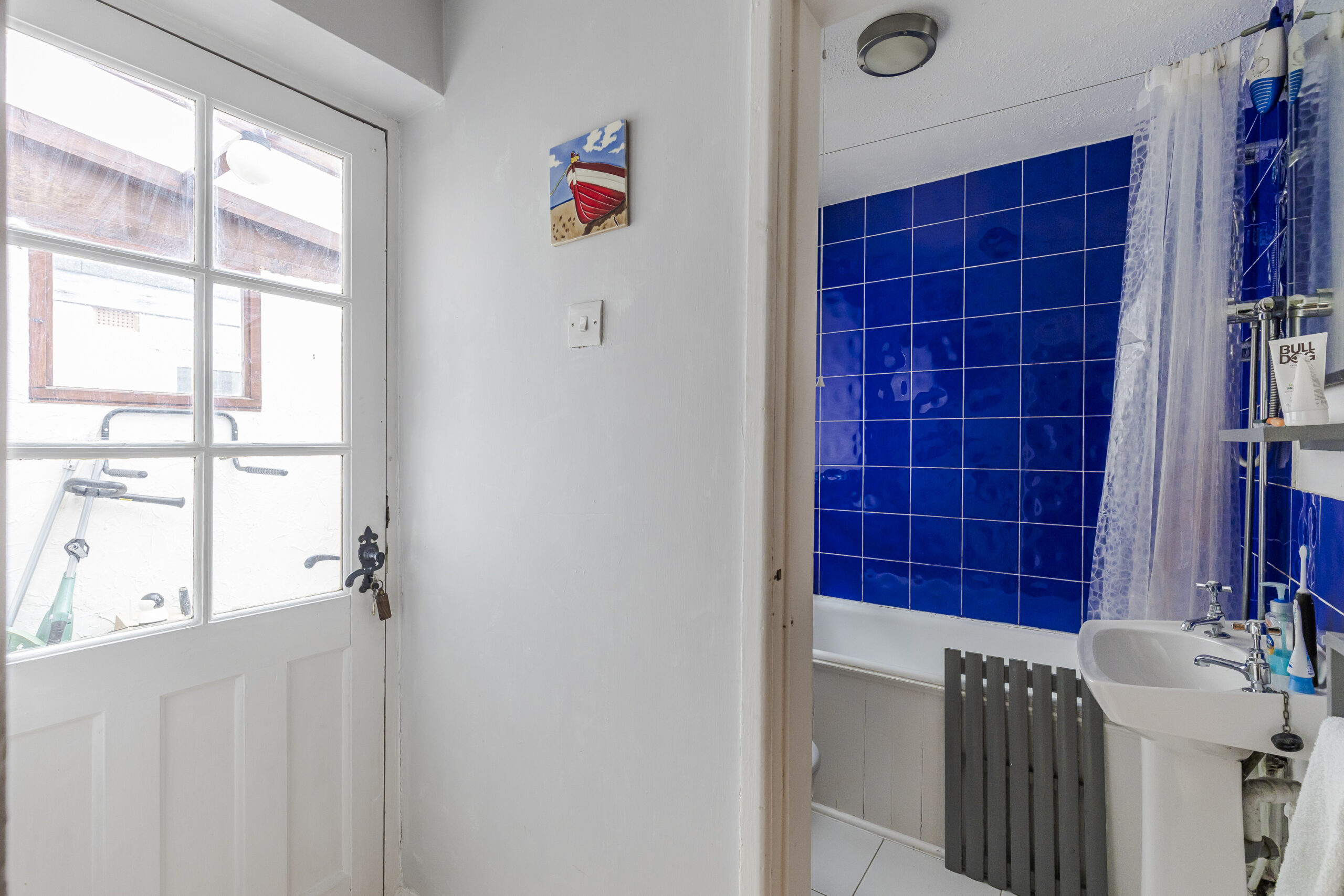 The kitchen provides access to the bathroom and a lean-to utility area. The bathroom comprises a three-piece suite including bath, toilet and sink, with tiled flooring and walls. The lean-to offers additional storage space and access to the rear garden.